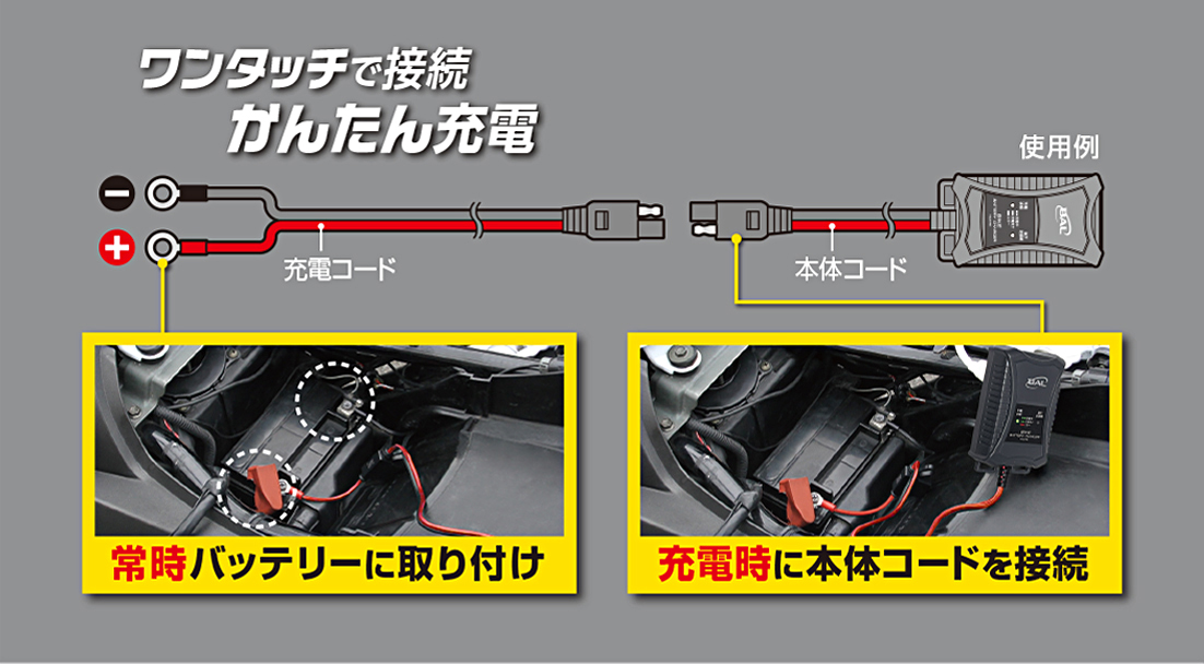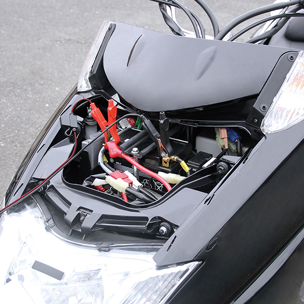 ■バッテリーターミナルを外さずに充電できます。(※原付などのカプラタイプを除く)