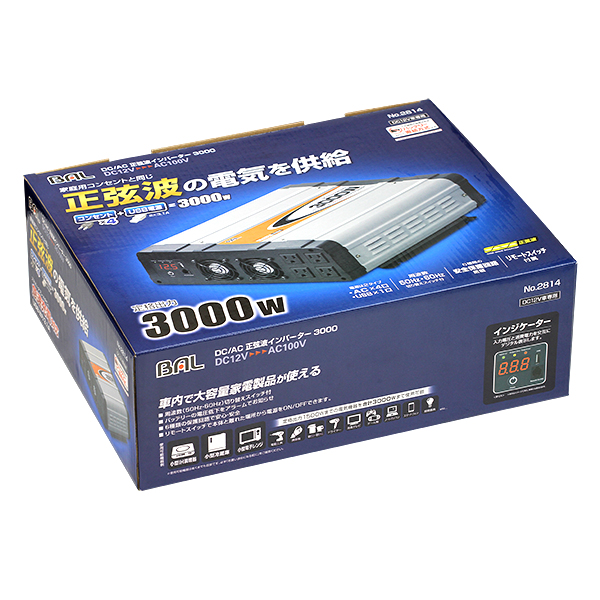 普通自動車のオルタネーター出力は約50〜70A程度ですが、アイドリング時は1/3程度の出力しか出ていない場合があります。インバーターで高消費電力を必要とする機器を接続してご使用の場合は、エンジンの回転数を上げることをお勧めします。