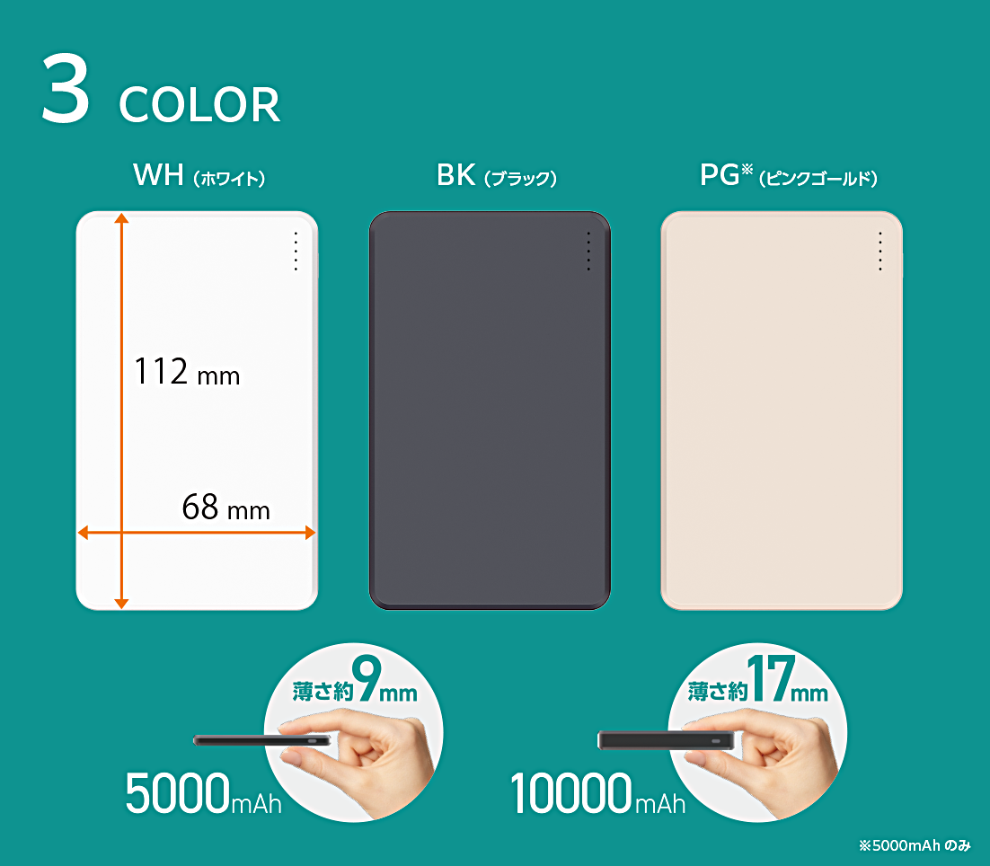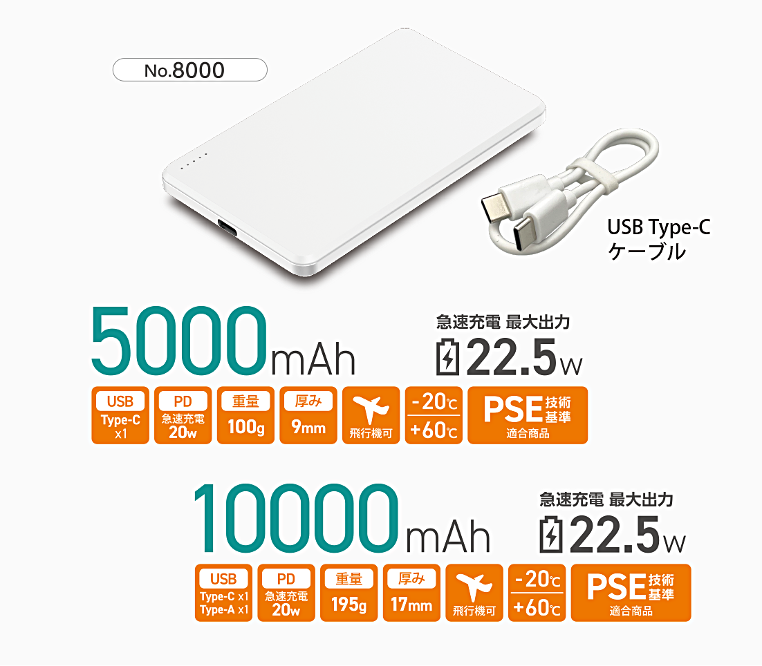 No.8000 , 8001 , 8002 , 8003 , 8004【NEW】準固体モバイルバッテリー 5000mAh(WH,BK,PG)/10000mAh(WH,BK)