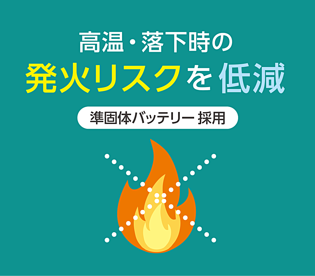 ※電解質をゲル化した準固体電池を採用し、リチウムデンドライトの発生を抑制。発火や破裂のリスクを低減します。