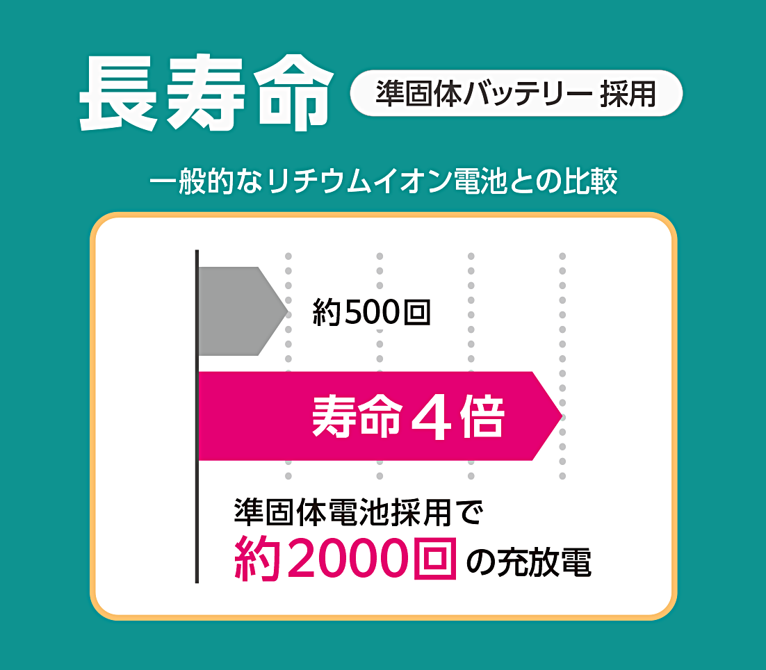 準固体リチウムイオン電池採用で約2000回の充放電に対応!