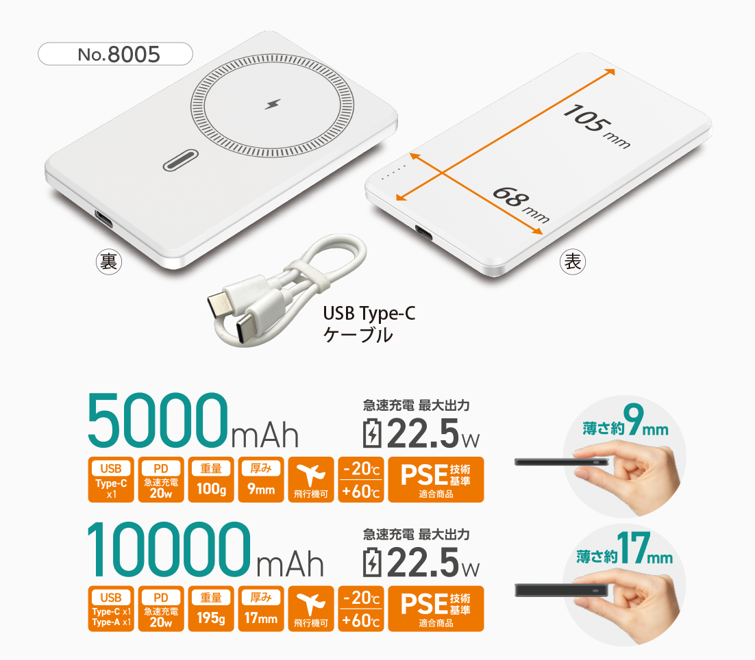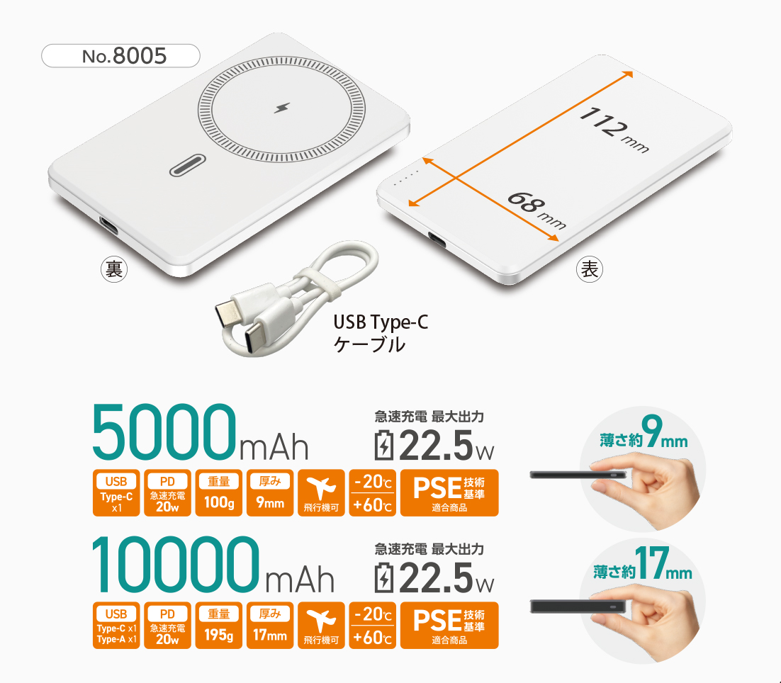 No.8005 , 8006【NEW】準固体モバイルバッテリー 5000mAh(WH)MAG/10000mAh(WH)MAG