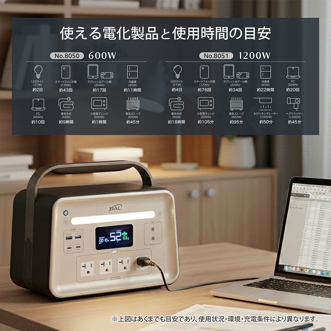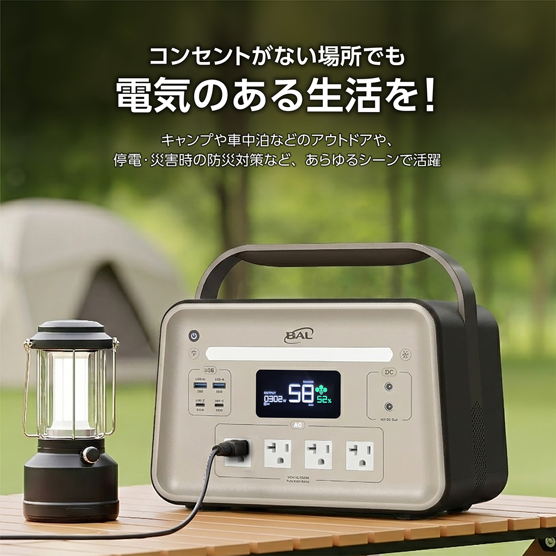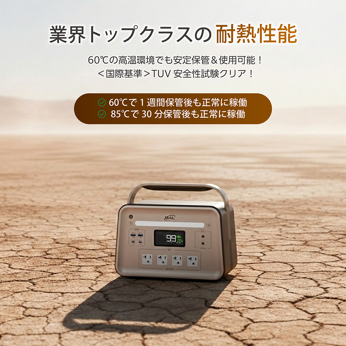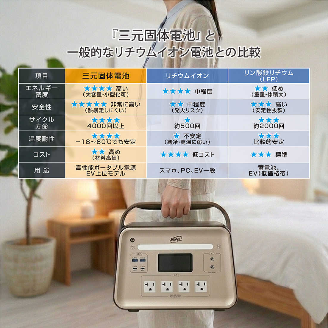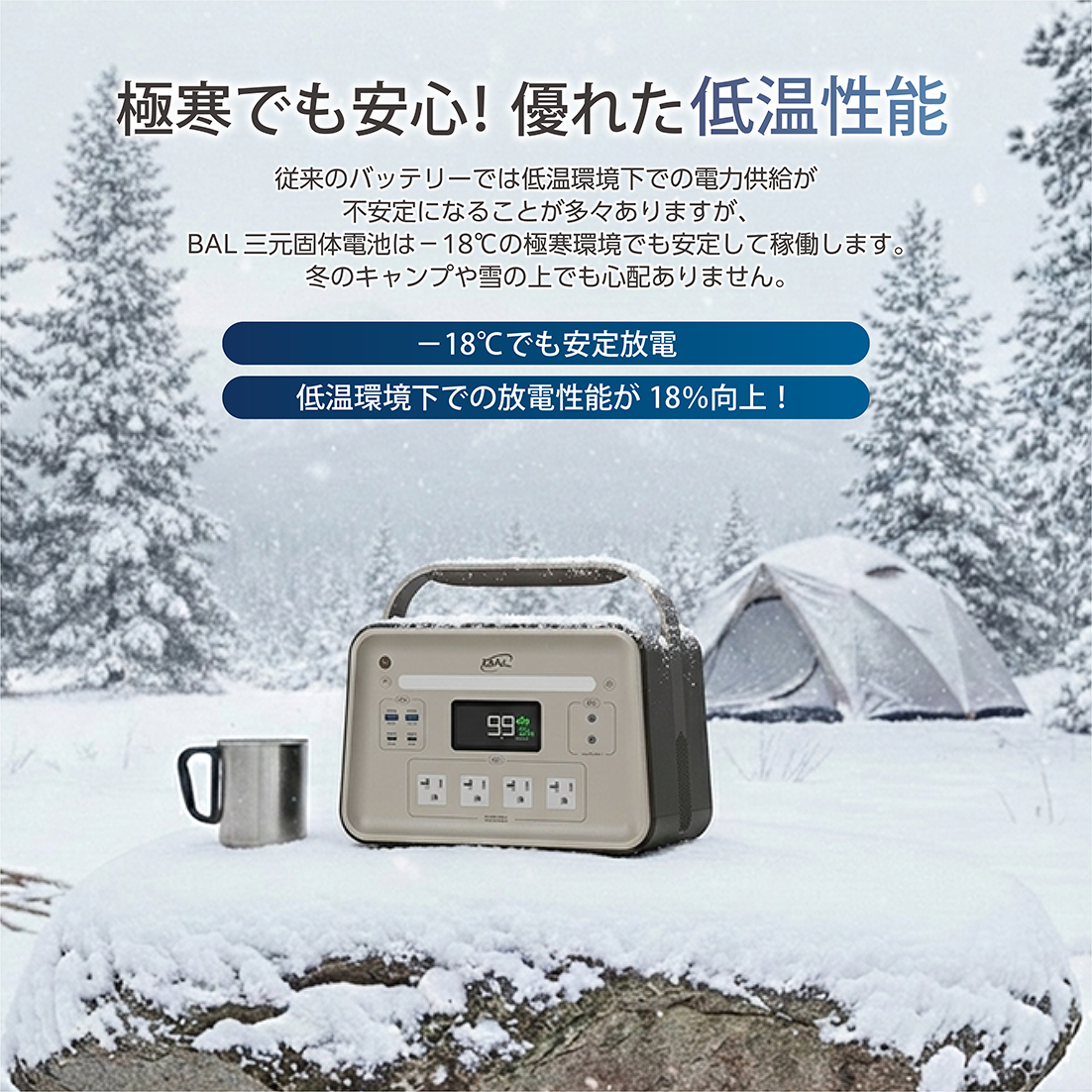 ・従来のバッテリーでは低温環境下での電力供給が不安定になることが多々ありますが、BAL三元個体電池は−18℃の極寒環境でも安定して稼働します。冬のキャンプや雪の上でも心配ありません。